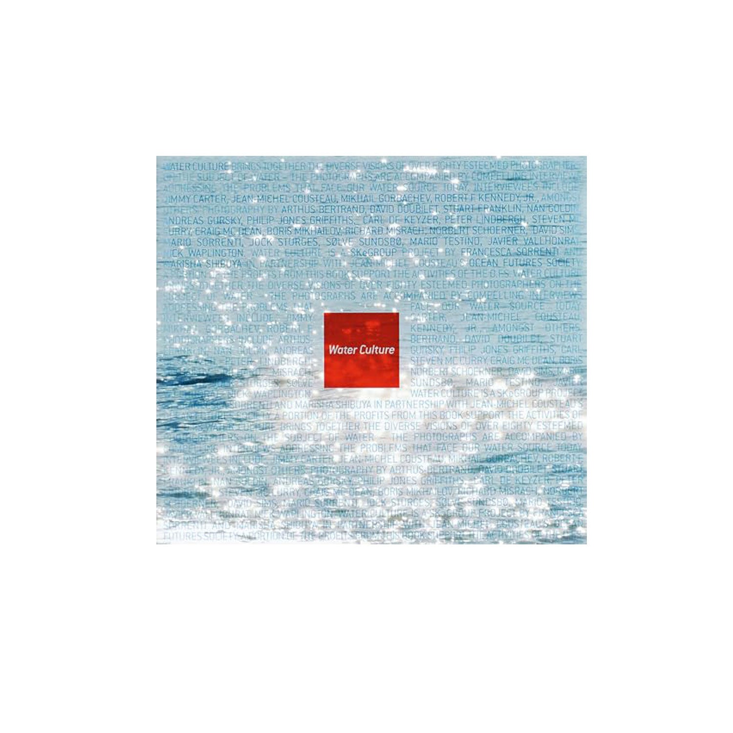 H2O. The Dead Sea. Rain. Acid rain. Heavy water. The Pacific, the Atlantic, the Indian Ocean, the source of the Nile. A tap, and on and on More than 1 billion people have insufficient water to sustain life. The World Health Organisation has the figures. The River Jordan, the Biblical epitome of water, is dying, like a man with his throat cut, his blood seeping down a drain. In Water Culture, Francesca Sorrenti of ske group, in collaboration with Ocean Futures Society's Jean-Michel Cousteau, has collected a kaleidoscope of the elemental qualities of water in a series of photographs that are breathtaking to behold in their fantasy and equilibrium. They chose the works of Mario Sorrenti, Nan Goldin, Fabien Baron, Andres Gursky, Eugene Smith, and Boris Michailov, among others, to represent this world. Against these extraordinary images are set the records of the follies of mankind, the greed and despair and ignorance of the source of life that will again leave a bewildered albatross or a seal coated in oil by another Amoco Cadiz that has spilt 250,000 tons of human degradation into the oceans.